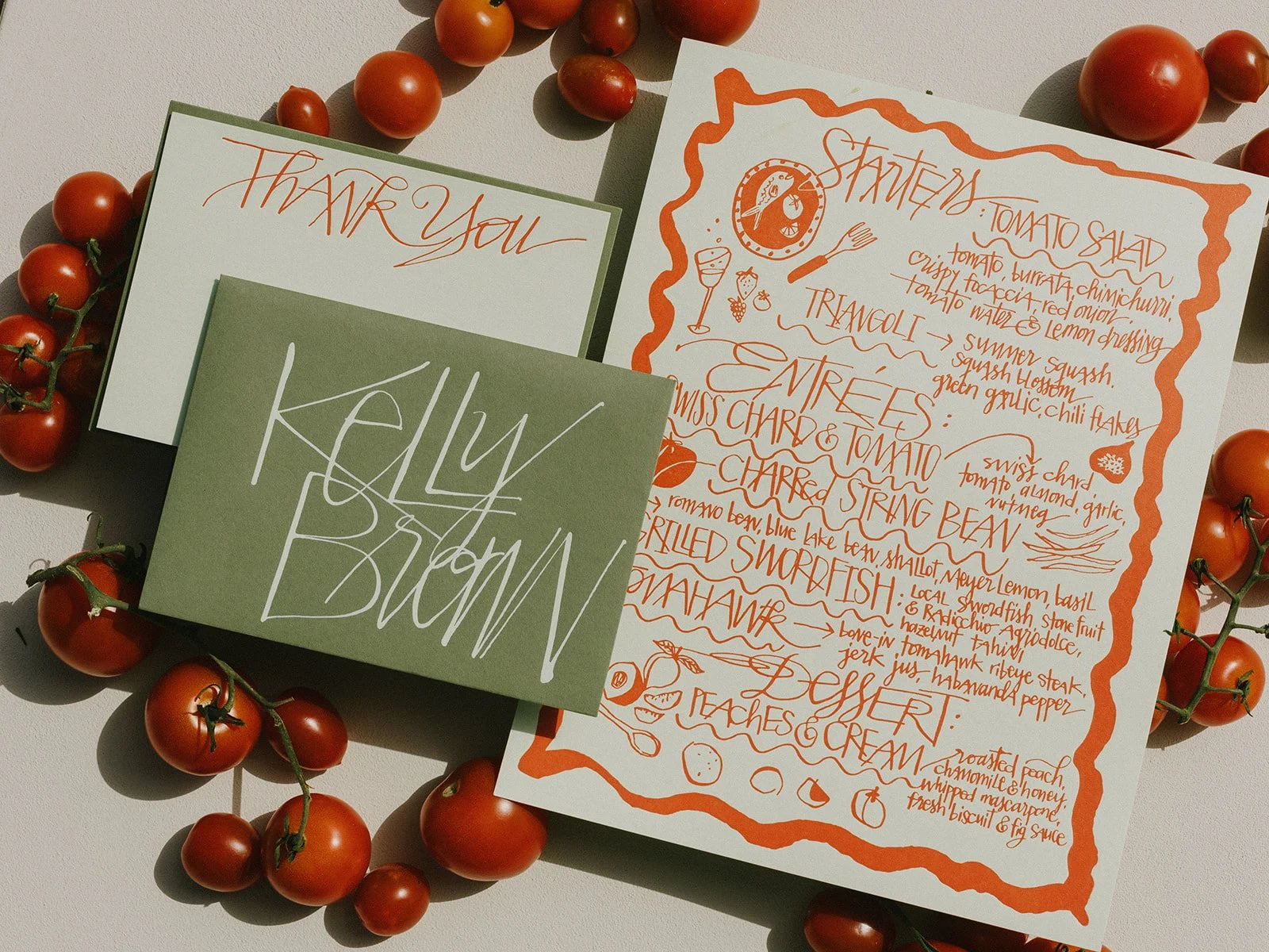 The true masterpiece was the single, long dining table, draped in luxurious linens and adorned with candles, over-the-top floral centerpieces, and strings of ripe tomatoes. Siren Floral Co.'s bold take on mixing colors like red and green resulted in a beautiful event design.